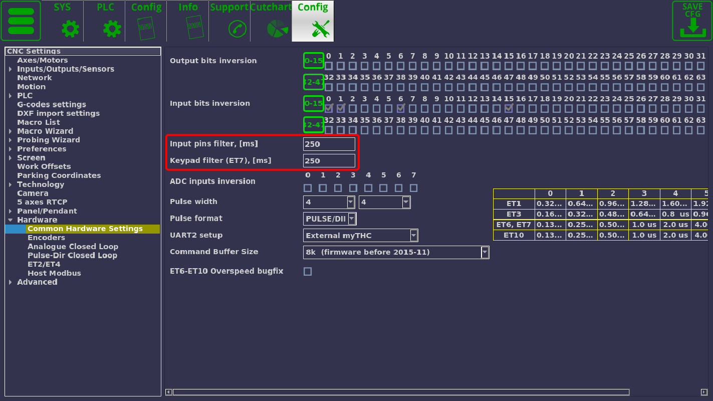 The latest release of myCNC software brings improvements to filter out unwanted signals on common inputs, as well as signals sent from the operator panel. These settings can be found by going into Settings > Config > Hardware > Common Hardware Settings within the myCNC application: