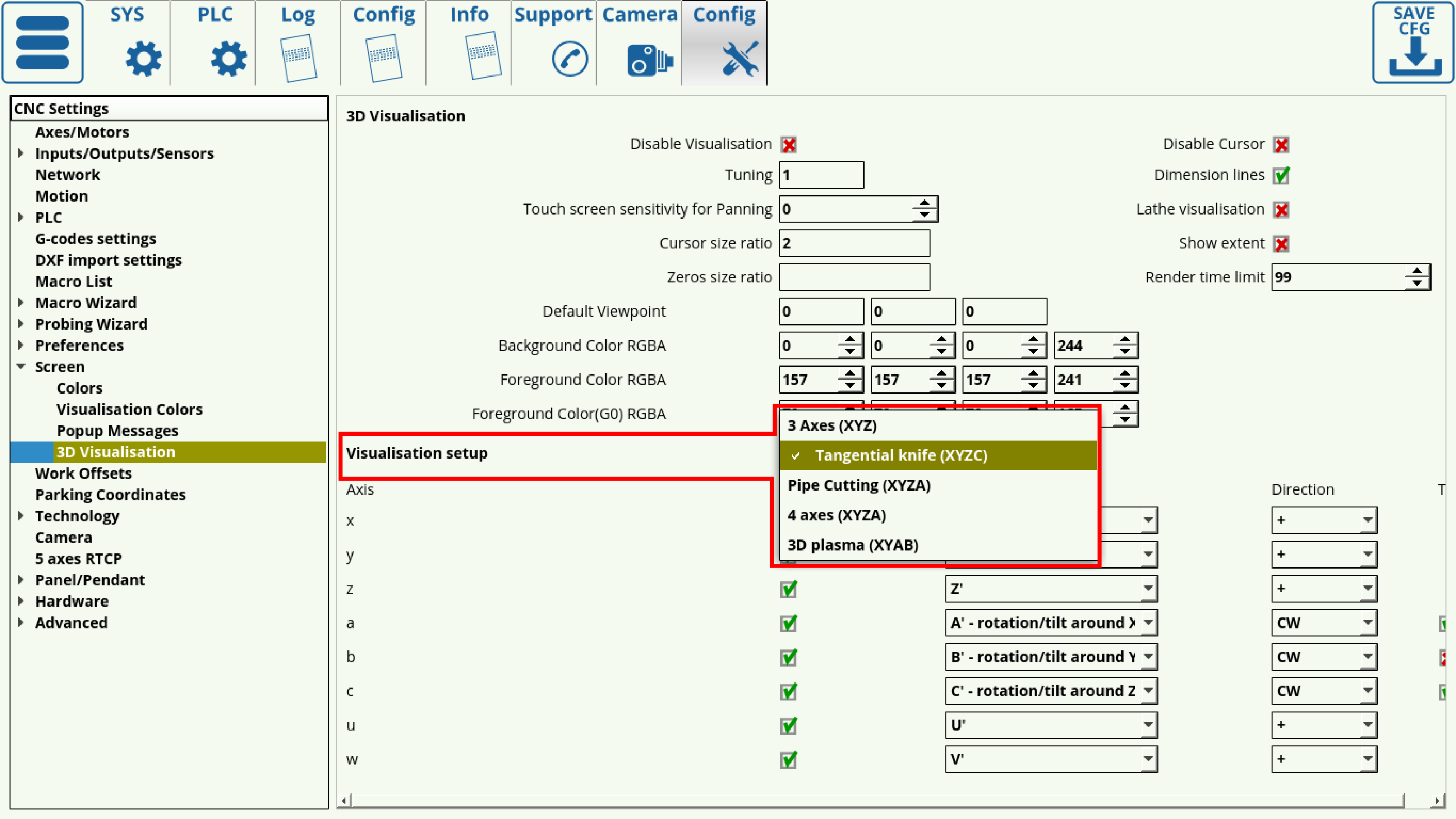 - 3D visualization settings enhancements - the Settings > Config > Screen > 3D Visualization window now allows to choose common presets for machine setups, such as 3 Axes, Tangential Knife, Pipe Cutting and 3D Plasma. This allows to select the common presets with the proper Axes, Directions and Tilt settings without having to manually set up this information in the full table below.