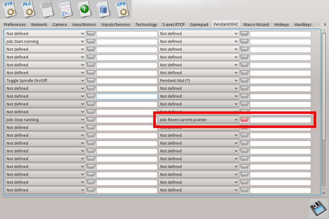 7.1 Press button "Reset" on WHB04-L Pendant panel. Find led highlighed on XHC setup dialog. Assign slot "Job: Reset current pointer" for this button.