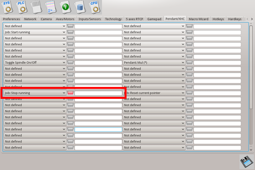 7.2 Press button "Stop" on WHB04-L Pendant panel. Find led highlighed on XHC setup dialog. Assign slot "Job: Stop running" for this button.