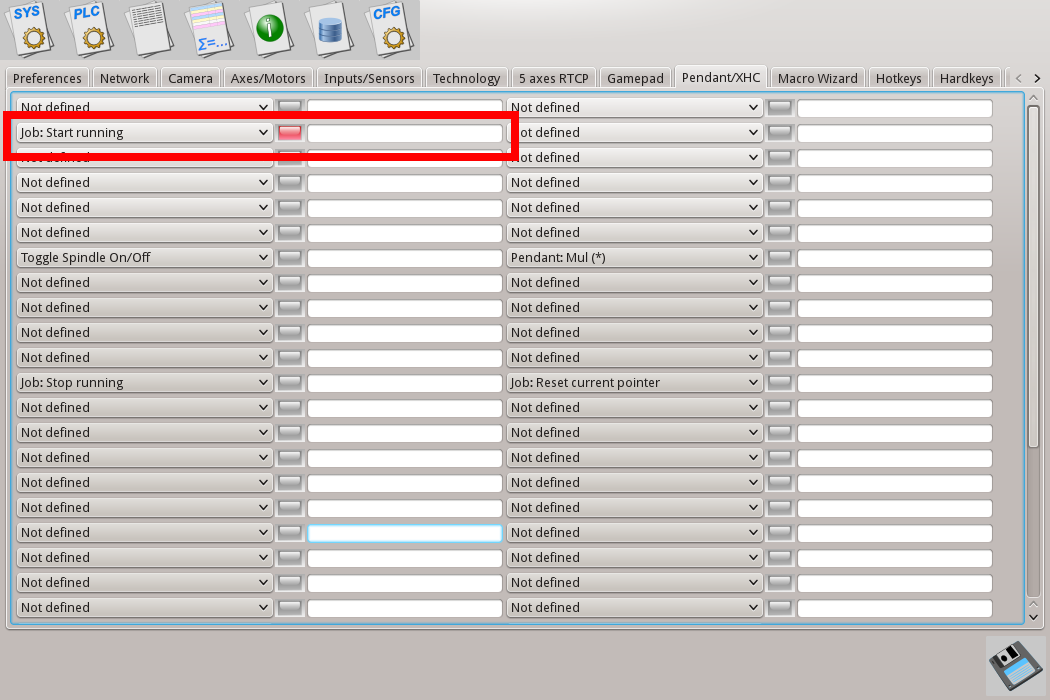 7.3 Press button "Start" on WHB04-L Pendant panel. Find led highlighed on XHC setup dialog. Assign slot "Job: Start running" for this button.