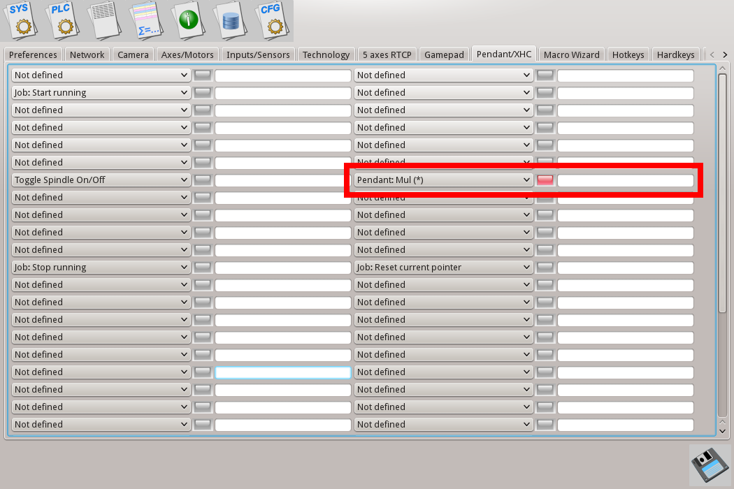7.4 Press button "Step++" on WHB04-L Pendant panel. Find led highlighed on XHC setup dialog. Assign slot "Pendant Mul(*)" for this button. Pressing on this button will change Pendant wheel step.