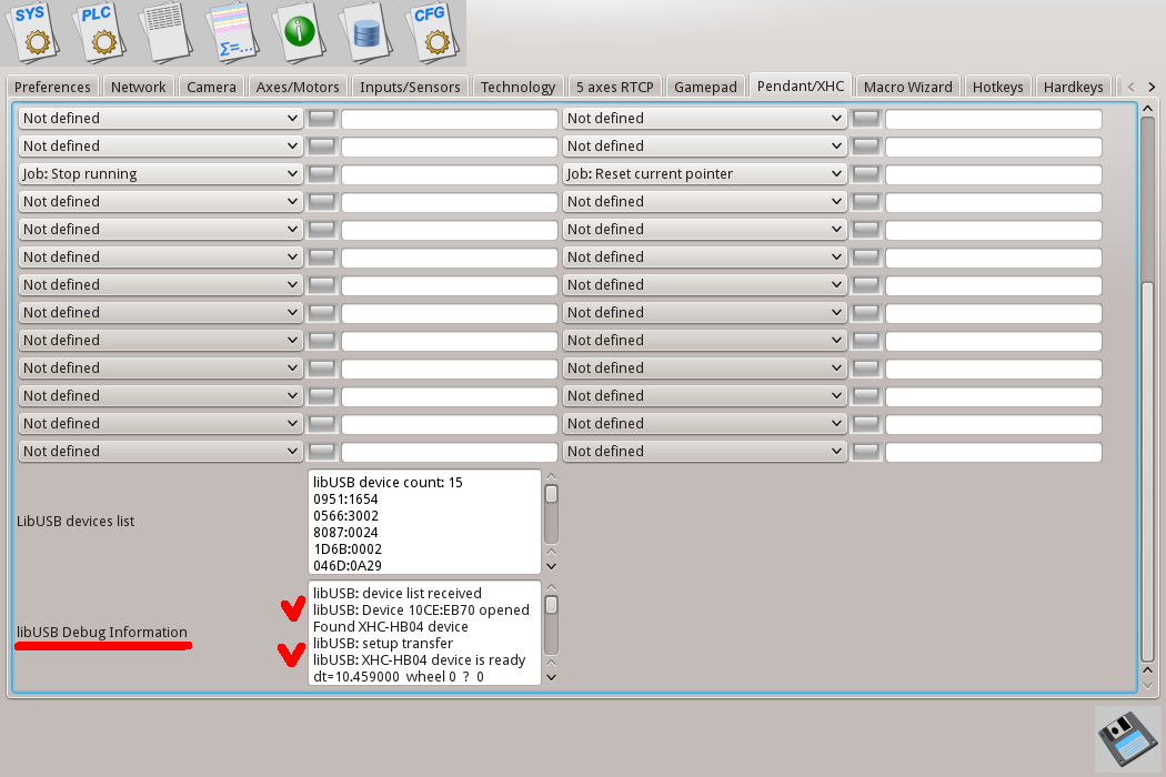 present in "LibUSB devices list" window. If device is present, myCNC software should get access to XHC Pendant control over "libusb" driver.
