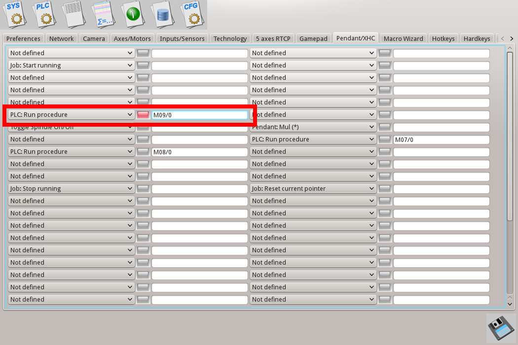 7.5 Assign M09 PLC procedure to button "Macro-1". Press button "Macro-1" on WHB04-L Pendant panel. Find led highlighed on XHC setup dialog. Assign slot "PLC: Run procedure" and fill parameter with "M09/0". It means load PLC procedure "M09" and initialize PLC parameter to "0". PLC procedure parameter value desn't matter for this example, however parameter is mandatory according command syntax and should be given in command line.