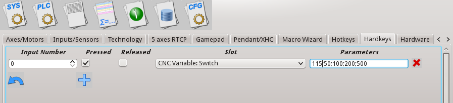 | CNC Variable: Switch | Switch CNC variable between several predefined values. Parameters divided by ";". The first parameter is CNC variable address (Index in global array). Rest parameters are values list. If slot activated (hardkey pressed/released) CNC variable value will be switched between given values |