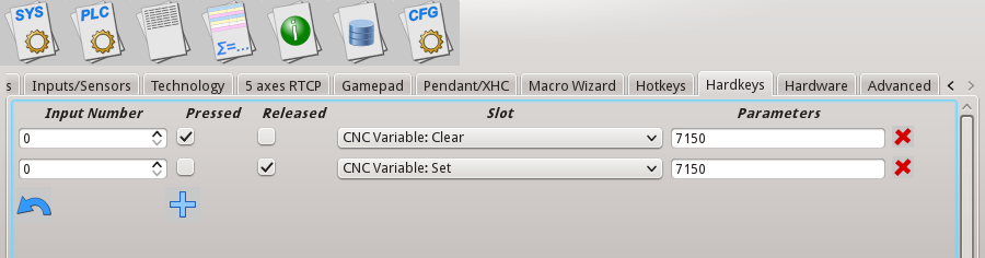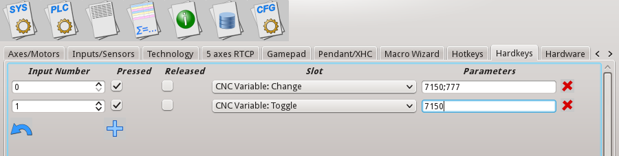 | CNC Variable: Toggle | Switch CNC variable between values "0", "1". Parameters contains address of CNC Variable in Global variables array. If slot activated (hardkey pressed/released) CNC variable value will be switched between given values |