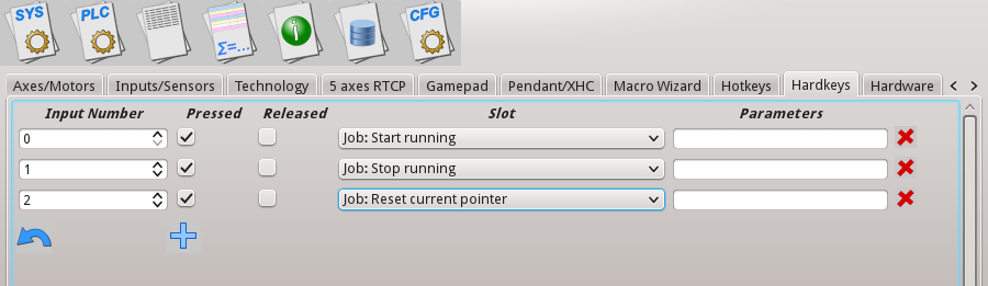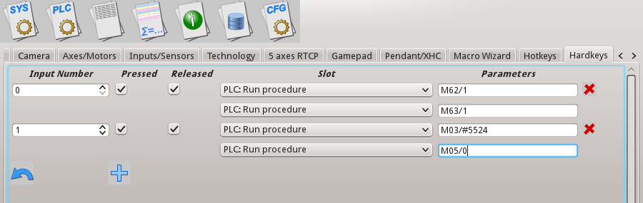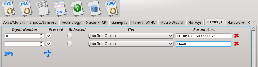- "Add" button. Press this button to add new hardjey configuration line. After new line added, it should be configured and saved. myCNC softwrae should be resterted to hardkey configuration takes effect.