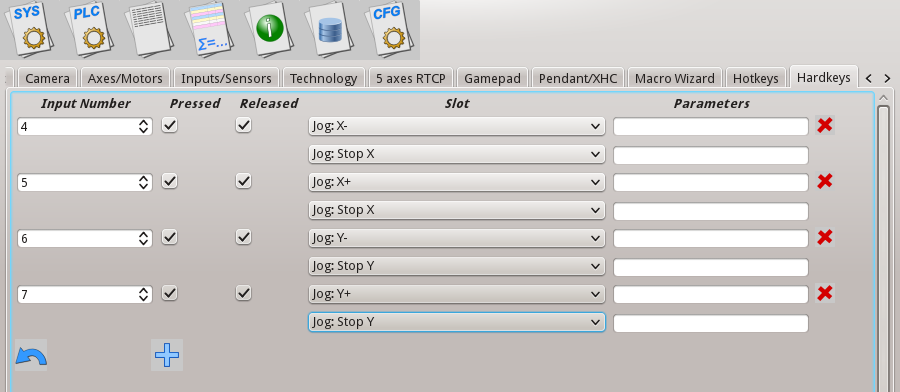 Keys attached to binary inputs #4, #5, #6, #7 are programmed as XY Joystick for Jog in XY direction. |